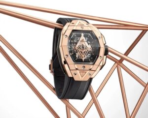 O primeiro relógio lançado pela Hublot demorou mais de 3 anos pra ficar pronto entre as pesquisas e desenvolvimento, até a sua venda pros clientes que já estavam ansiosos pra conhecer a nova marca. A pulseira dele em borracha preta é inspirada nas escotilhas dos navios (Hublot significa “vigia” em Francês!), e além de ser uma escolha estética lindona, ela era funcional: adaptando-se a qualquer pulso oferecendo aquele conforto bacanudo pro sortudo. O luxo do ouro deu aquele toque sinistro final e impactou os clientes de primeira, atraindo vários admiradores e obviamente, haters!
